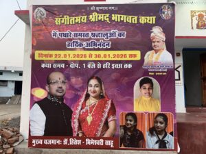 आयोजन समिति द्वारा बताया गया कि प्रतिदिन दोपहर 1 बजे से “हरि इच्छा तक” कथा का वाचन होगा। कथा वाचन हेतु श्रीधाम बहेरघट (बेमेतरा) से पधारे परमपूज्य आचार्य श्री रूपेश शास्त्री जी (शिक्षा – वृंदावन धाम) कथा का रसपान कराएंगे। उनके साथ उपाचार्य के रूप में सौम्य कृष्ण महाराज जी भी उपस्थित रहेंगे।