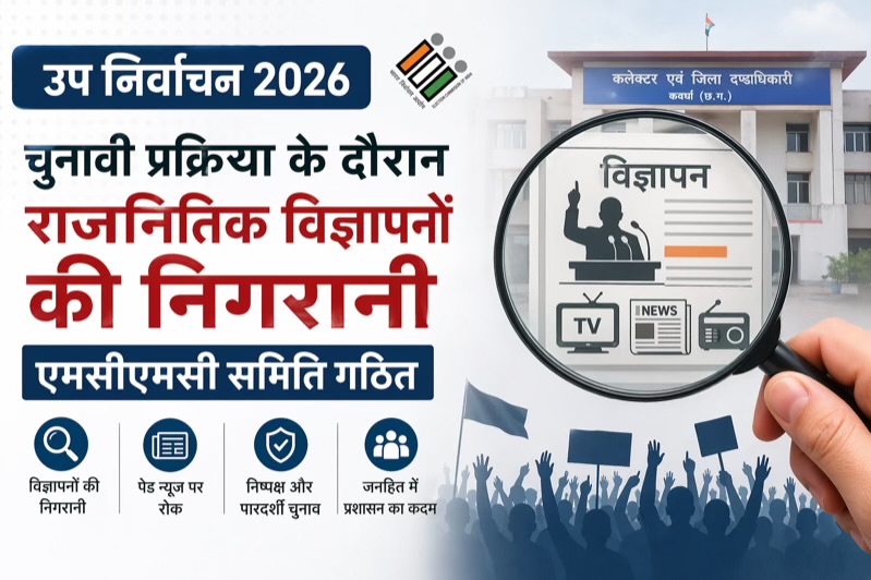 सहसपुर लोहारा / कबीरधाम। नगर पालिकाओं के उप निर्वाचन 2026 के तहत निष्पक्ष और पारदर्शी चुनाव सुनिश्चित करने के उद्देश्य से जिला प्रशासन ने महत्वपूर्ण कदम उठाया है। कलेक्टर एवं जिला निर्वाचन अधिकारी गोपाल वर्मा ने नगर पंचायत सहसपुर लोहारा के अध्यक्ष पद के निर्वाचन को ध्यान में रखते हुए जिला स्तरीय मीडिया प्रमाणन एवं अनुवीक्षण समिति (एमसीएमसी) तथा दत्त मूल्य समाचार विनियमन समिति का गठन किया है।