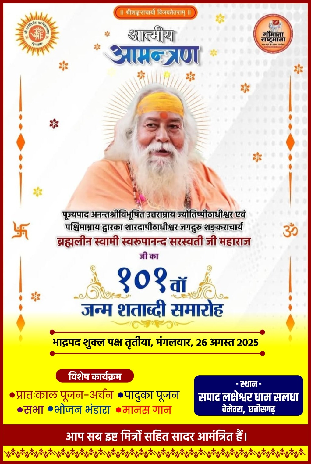 आज सपाद लक्षेश्वर धाम सलधा मे परम पूज्य गुरूदेव ब्रह्मलीन अनंत श्री विभूषित द्विपीठाधीश्वर जगद्गुरु शंकराचार्य स्वामी श्री स्वरूपानंद सरस्वती जी महाराज का 101 वां प्राकट्योत्सव मनाया जाएगा आप सभी सादर आमंत्रित है
