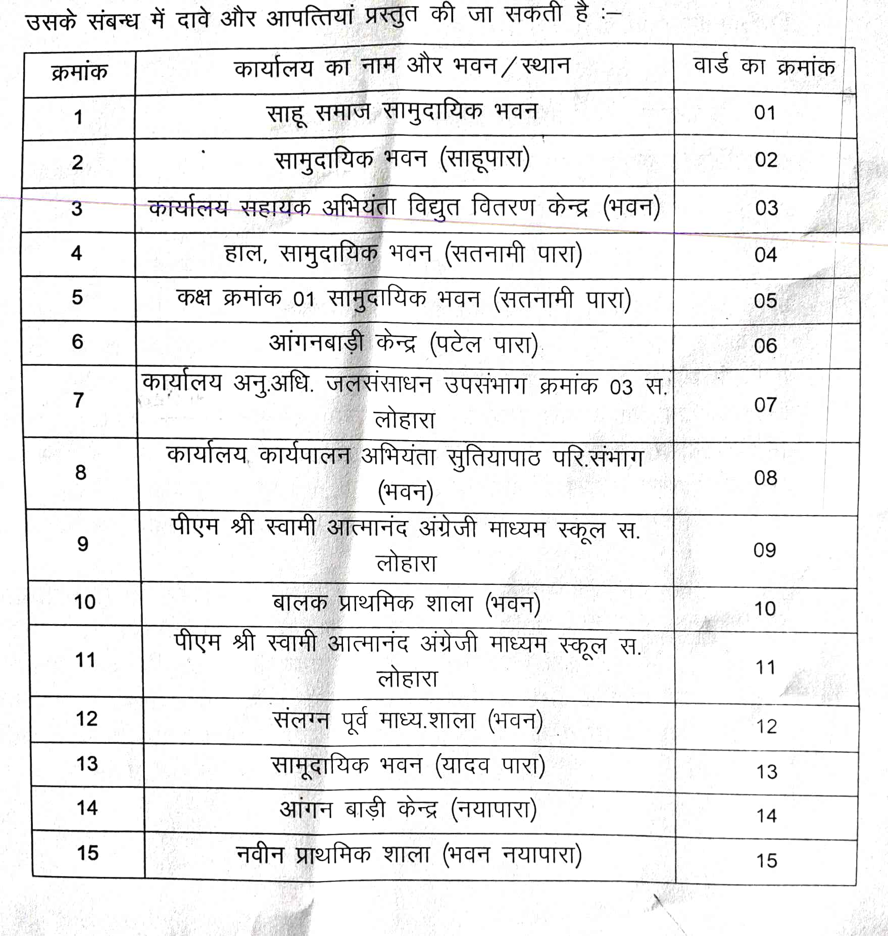 • कवर्धा / सहसपुर लोहारा – जिनको भी नगर पंचायत निर्वाचन मे मतदाता सूची में नाम जोड़ना, कटवाना व वार्ड परिवर्तन करना हो सम्बंधित वार्ड के शिविर स्थान में जाकर फॉर्म भर सकते हैं