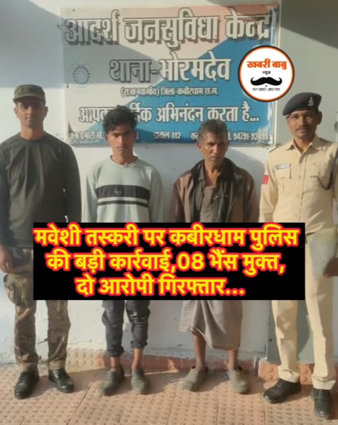 पुलिस से मिली जानकारी के अनुसार दिनांक 26 फरवरी 2026 को थाना भोरमदेव पुलिस स्टाफ को सूचना प्राप्त हुई थी कि कुछ व्यक्ति मवेशियों को अवैध रूप से बिना वैध दस्तावेज के ले जा रहे हैं। सूचना पर त्वरित कार्रवाई करते हुए पुलिस टीम ने ग्राम केसदा कांजी हाउस के सामने घेराबंदी की और दो संदिग्ध व्यक्तियों को पकड़ लिया।