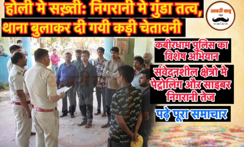 होली पर सख्ती: निगरानी में गुंडा तत्व, थाना बुलाकर दी गई कड़ी चेतावनी,कबीरधाम पुलिस का विशेष अभियान, संवेदनशील क्षेत्रों में पेट्रोलिंग और साइबर निगरानी तेज,पढ़े पूरा समाचार…?