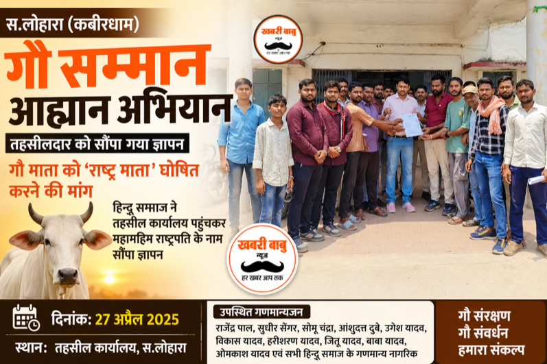 स.लोहारा (कबीरधाम), 27 अप्रैल। क्षेत्र में गौ संरक्षण और सम्मान को लेकर सोमवार को हिन्दू समाज द्वारा व्यापक स्तर पर “गौ सम्मान आह्वान अभियान” चलाया गया। इस अभियान के तहत सहसपुर लोहारा तहसील कार्यालय में बड़ी संख्या में लोग एकत्रित हुए और तहसीलदार को ज्ञापन सौंपते हुए गौ माता को ‘राष्ट्र माता’ घोषित करने की मांग की।